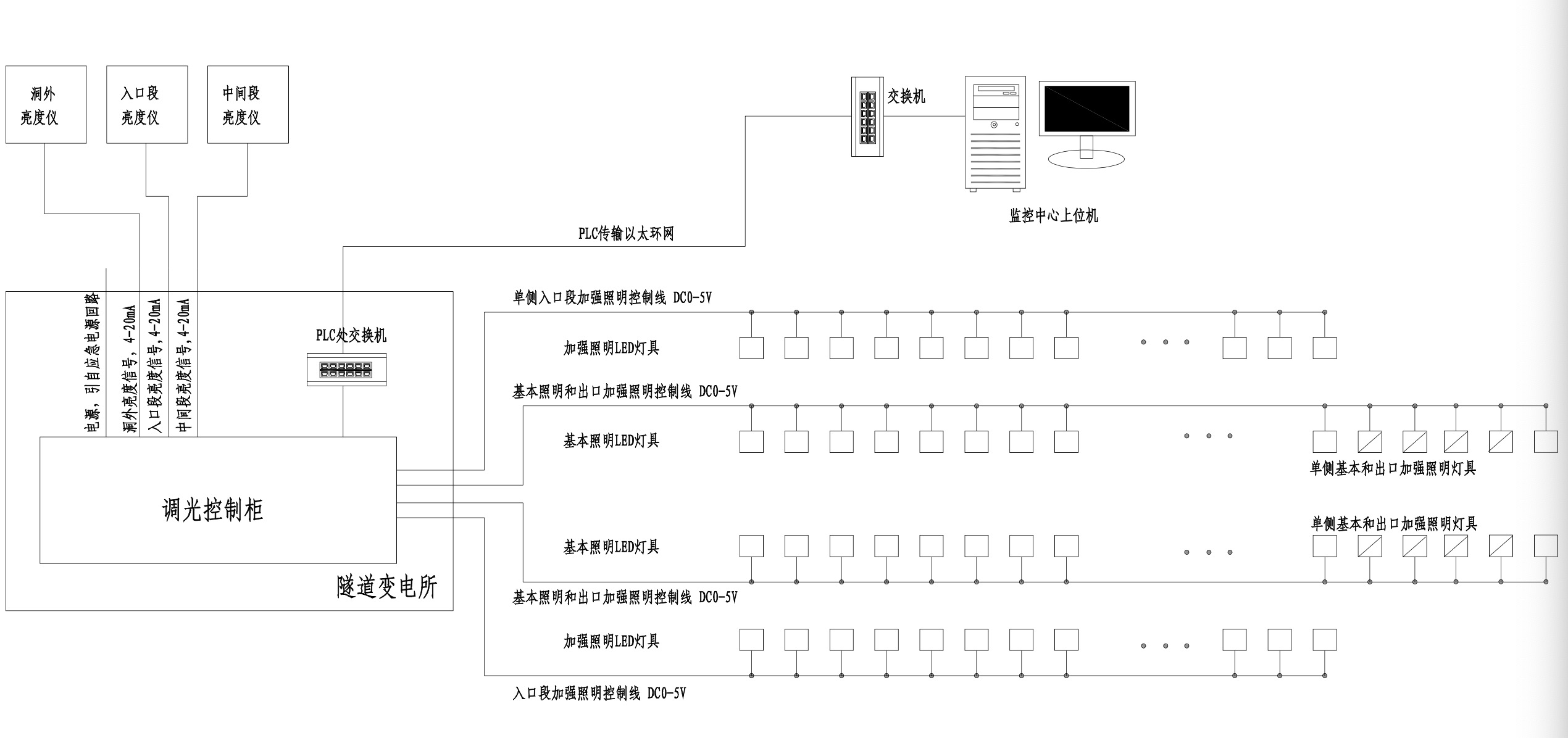控制方式:LED隧道燈的0-10V調光可以通過手動控制和自動控制兩種方式實現。手動控制可以通過旋鈕或開關來改變控制器輸出的電壓值;自動控制可以通過外部傳感器或智能控制系統來實現,根據環境光照變化或預設的調光方案來自動調節LED燈的亮度。環境光照一般是通過亮度采集儀來收集參數,在隧道洞外、洞口和基本照明段設置亮度采集儀。